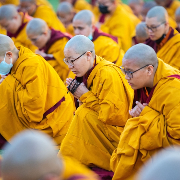 On the first morning, before breakfast, teachers and students from the participating nunneries and shedras made their way to the grounds of the Dhamek Stupa, a short distance from the Vajra Vidya Institute. There they received the Mahayana Sojong vows from Drupon Dechen Rinpoche in preparation for the Ritual for Women’s and Especially Nuns’ Dharma to Flourish which they offered that morning.